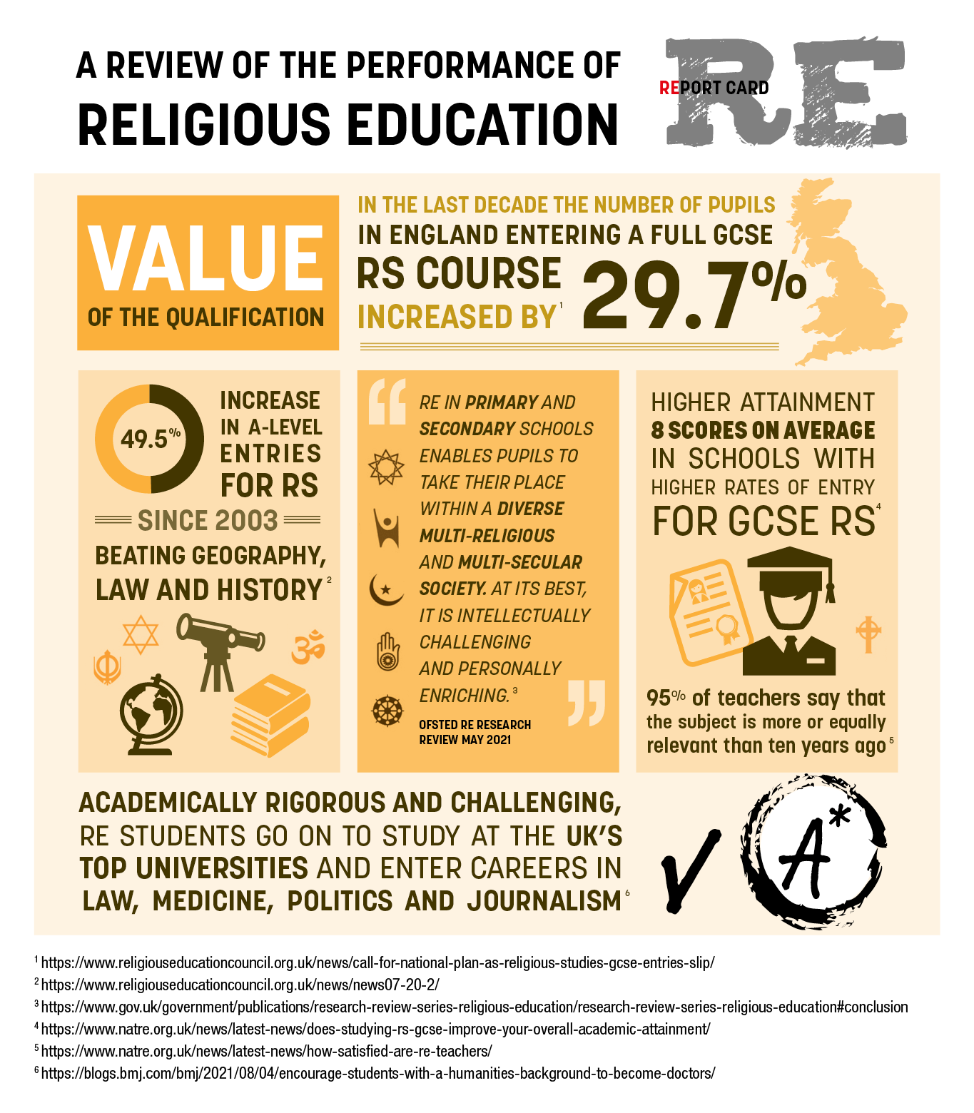 The comprehensive review of data, carried about by a team from the Religious Education Council of England and Wales (REC), the National Association of Teachers of Religious Education (NATRE), and RE Today Services, comes from a variety of sources, including an Ofsted subject report, public surveys, school workforce data, freedom of information requests, and interviews with teachers and students. It is the biggest ‘state of RE’ report for five years. We’ve graded the performance of schools, government and the subject itself in a review of five years of data.